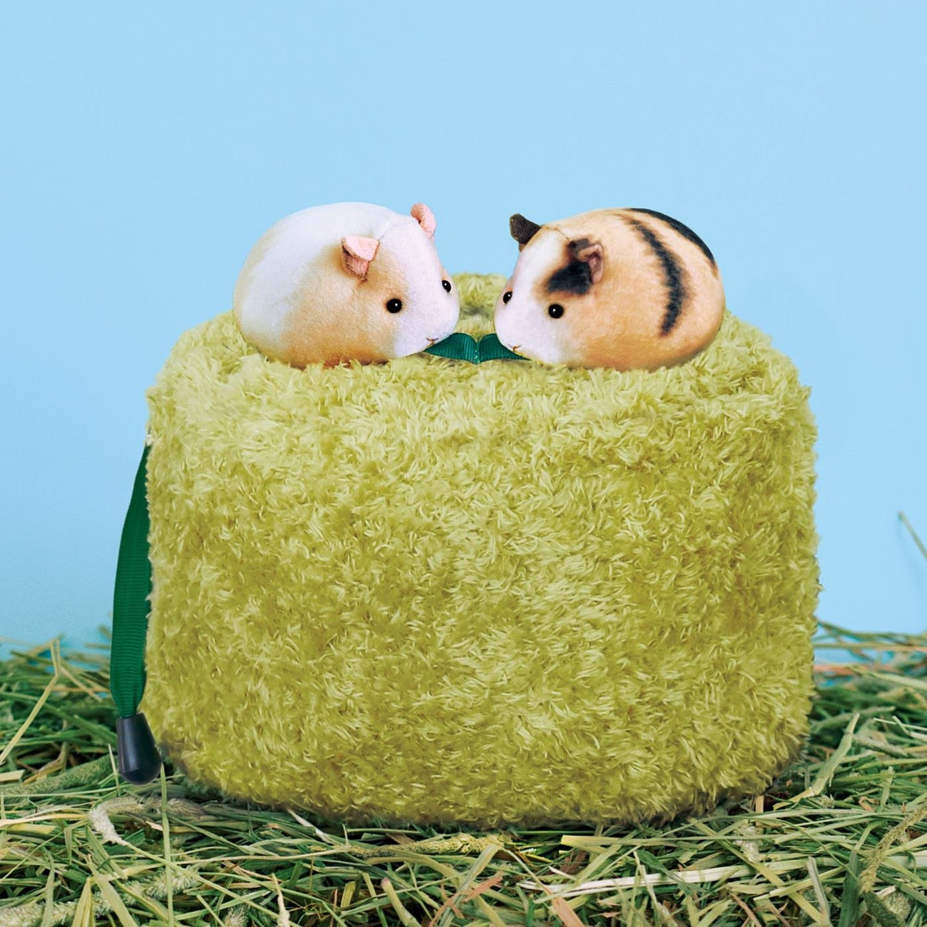 2匹のモルモットが草を両端から同時に食べ進める人気のシーンを再現したきんちゃくです。