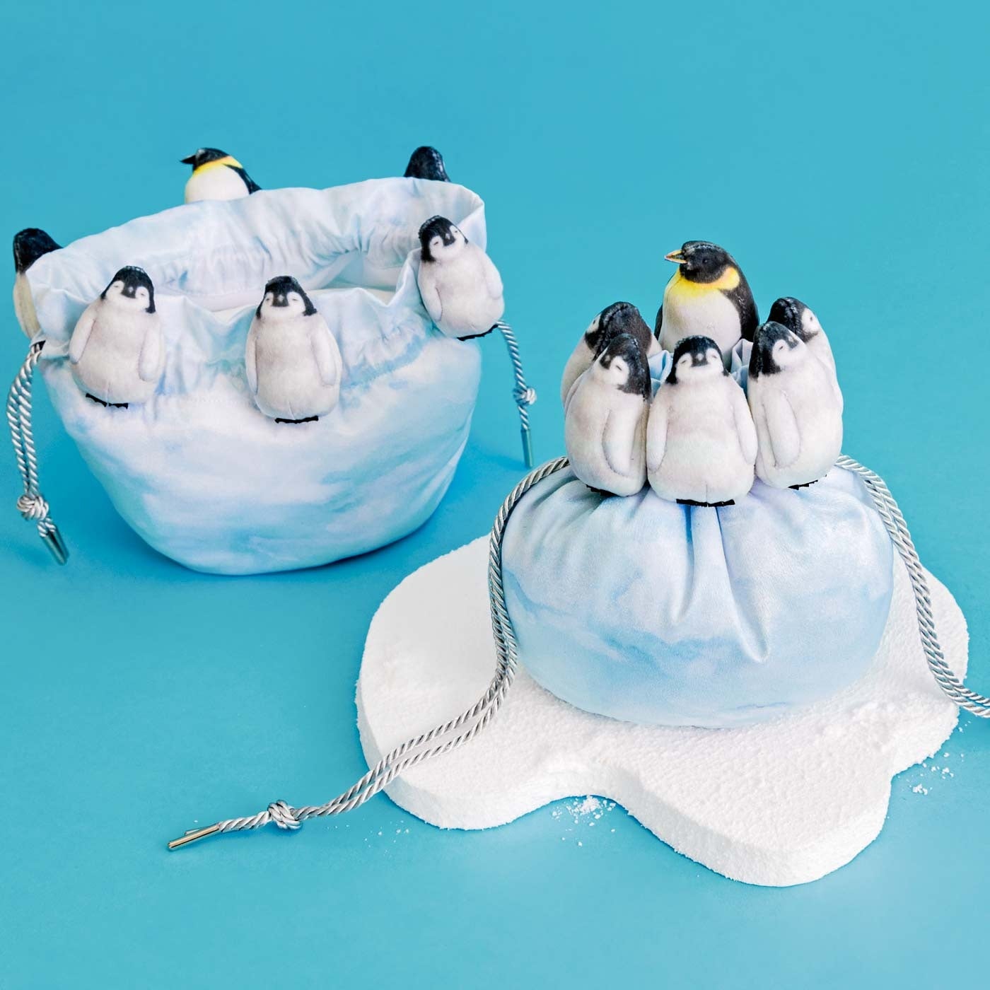 ひもをしぼると、離ればなれのペンギンたちがむぎゅっと集合するきんちゃくです。
