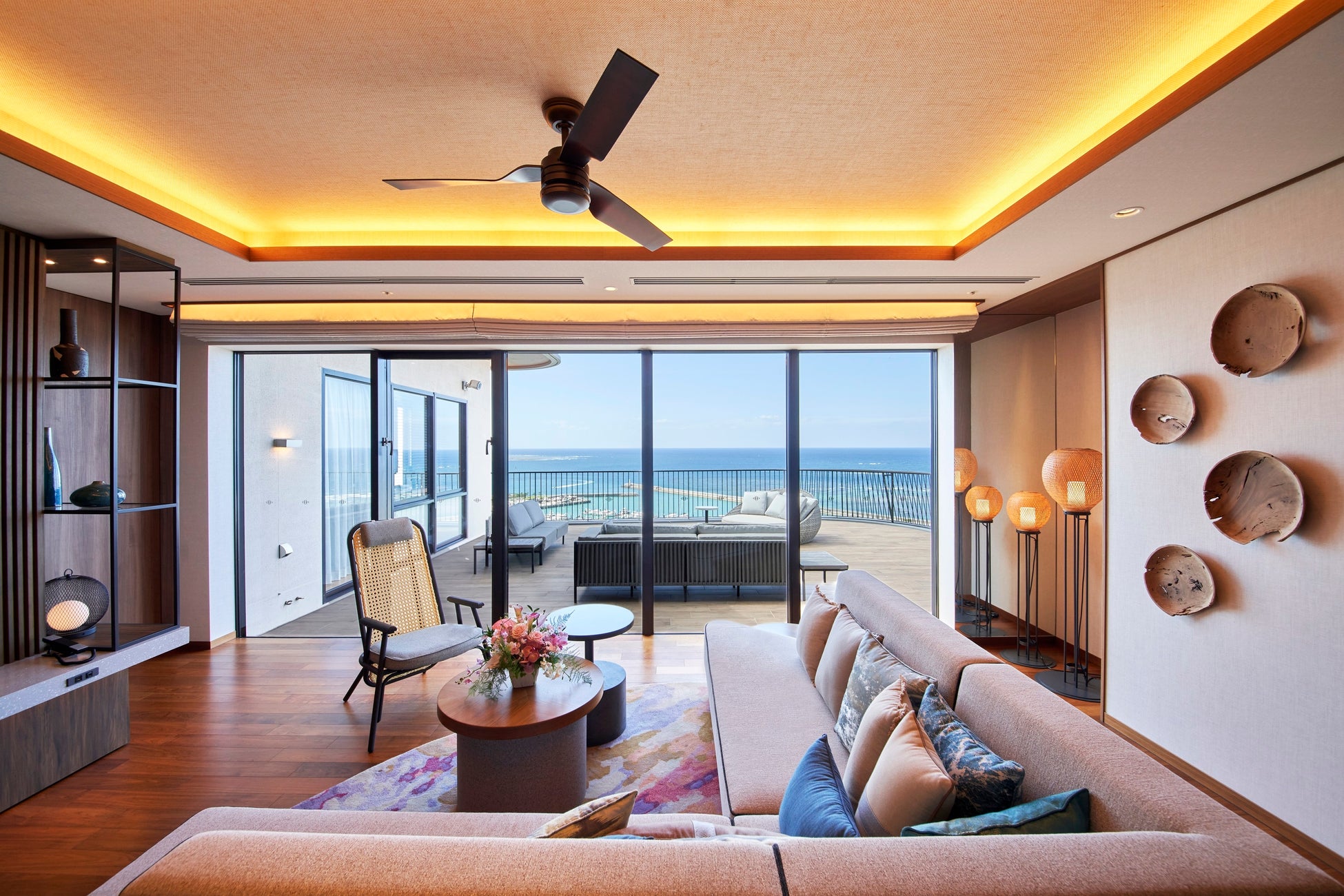 最上階から望む美ら海とサンセットを眺めながら、ハンドパンが奏でる美しい音色と共に、心ほどけるゆるやかな時間をクラブラウンジ「UMIKAJI」で癒しのひと時をお過ごしいただけます。