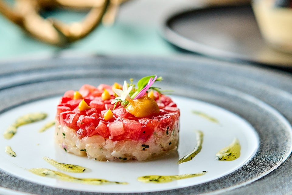 クリスマスランチコースは、一足早くホリデーシーズンが楽しめる全5品でご用意いたします。カリフラワーとズワイガニのくちどけ滑らかなムースをアミューズに、オードブルでは、トマトとイチゴの甘酸っぱさをアクセントにした帆立と甘エビのタルタルを。その他にも、鱈やアサリなど4種の魚介の旨みがたっぷりのブイヤベースなど心躍る品々が楽しめます。ディナーコースでは、洗練された盛り付けと旬の食材を巧みに使い、特別な時間に彩りとワクワク感を添える全6品をご堪能いただけます。タラバガニを贅沢に使ったオードブルは、見た目も赤、白、黄色のフェスティブ感あるカラーで華やかさを演出した一品に。外はカリっと、中はトロッとしたフォアグラのポワレは、口に入れた瞬間、一瞬で幸福感に包まれます。メインディッシュには、国産牛ヒレ肉のグリルが堪能でき、大きな雪の結晶をあしらったスペシャルなデザートで心ときめく最高の時間へと誘います。