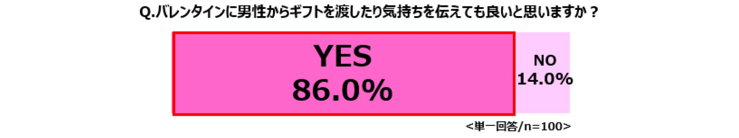日本のバレンタインと言えば、女性が男性にギフトを渡したり、気持ちを伝えるイベントとして知られていますが、世界には日本と真逆の“男性から女性へ”が文化の国も。そこで、「バレンタインに男性からギフトを渡したり気持ちを伝えたりしてもよいと思いますか?」と聞くと、86.0%の人がYESと回答! 婚活マッチングアプリユーザーの考え方の柔軟性が分かるとともに、日本流バレンタインに変化が起きる日が、すぐそこまで迫っているのかもしれません。
