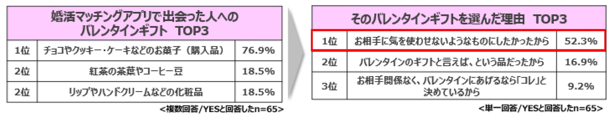 これらの結果を見ると、ギフトを渡すという心遣い、もらってうれしい・困らないギフトを選び、気を使わせない範囲の値段でセレクトする、まさに「気遣い」が、婚活マッチングアプリにおけるバレンタインのポイントのように感じられます。