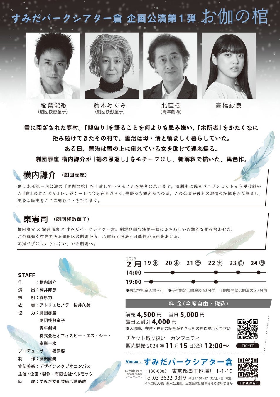 そんなすみだパークシアター倉が、2025年2月に満を持して劇場主催の公演をする。作品はすみだパーク構内に拠点を構える劇団扉座主宰であり、劇作家の横内謙介氏の「お伽の棺」。雪深い村で機屋に籠り、珍しい布を織ったのは異人の女であったという新解釈で描いた横内版「夕鶴」というべき異色作。