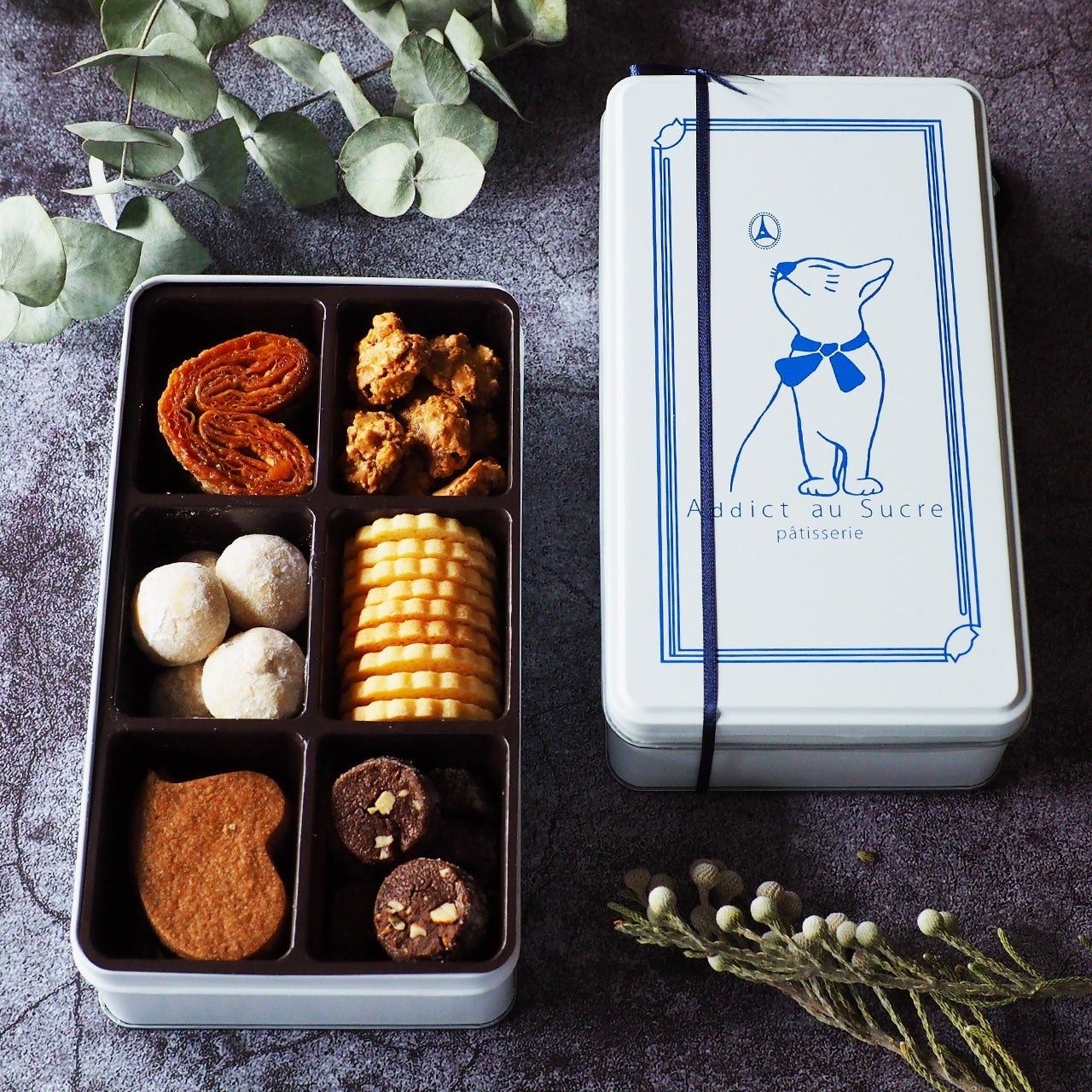 オーナーシェフの愛猫をモチーフにしたデザイン缶に6種の焼き菓子が入ったクッキー缶です。