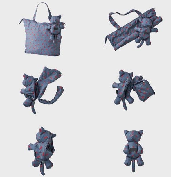 バッグは折り畳め、猫のチャーム(ぬいぐるみ)に簡単に収納可能。