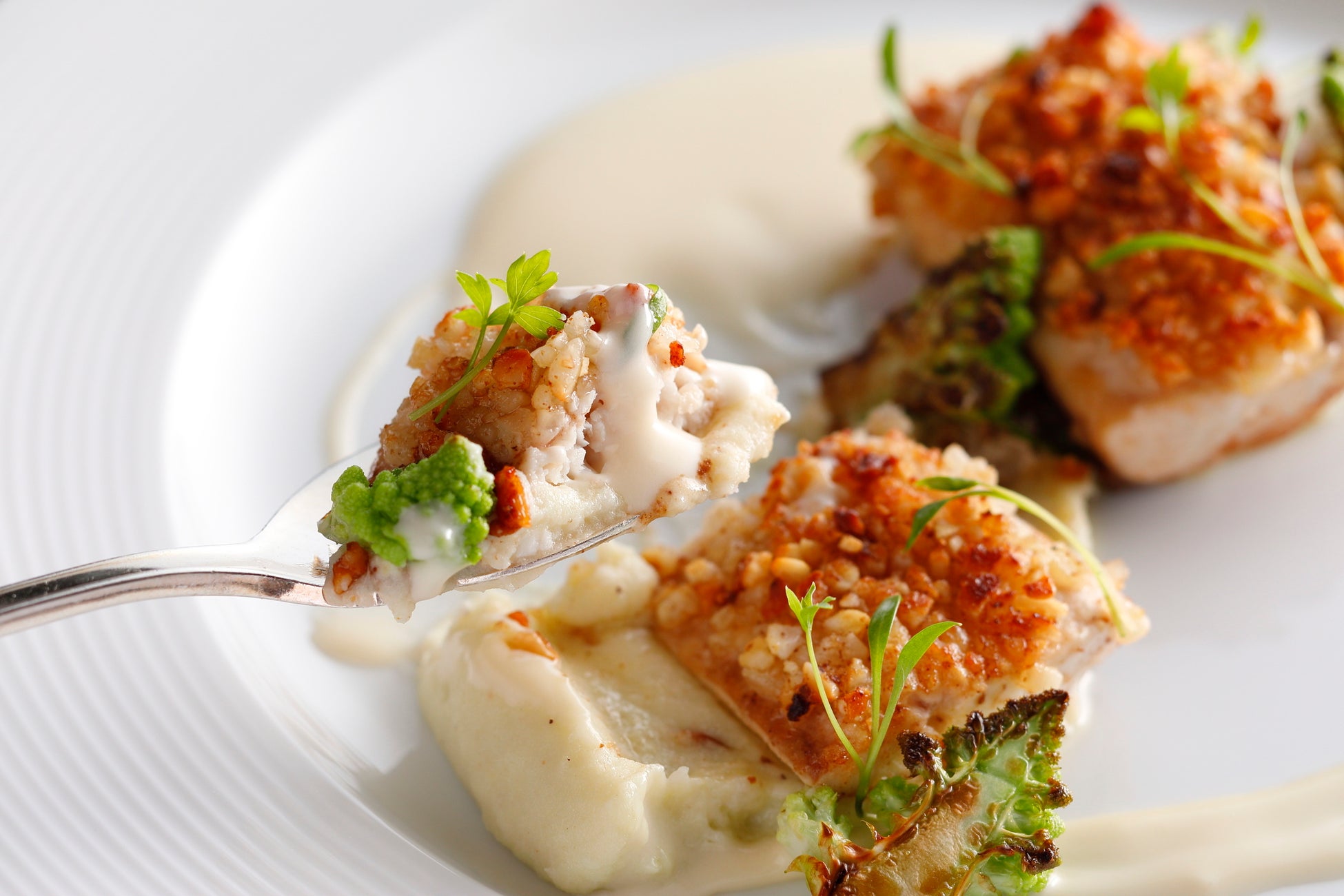 メインディッシュ:マカダミアンマヒマヒ ロマネスコ&ワサビマッシュポテト添え