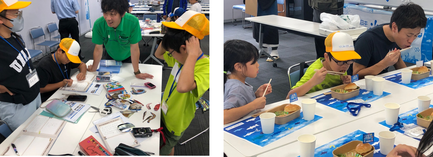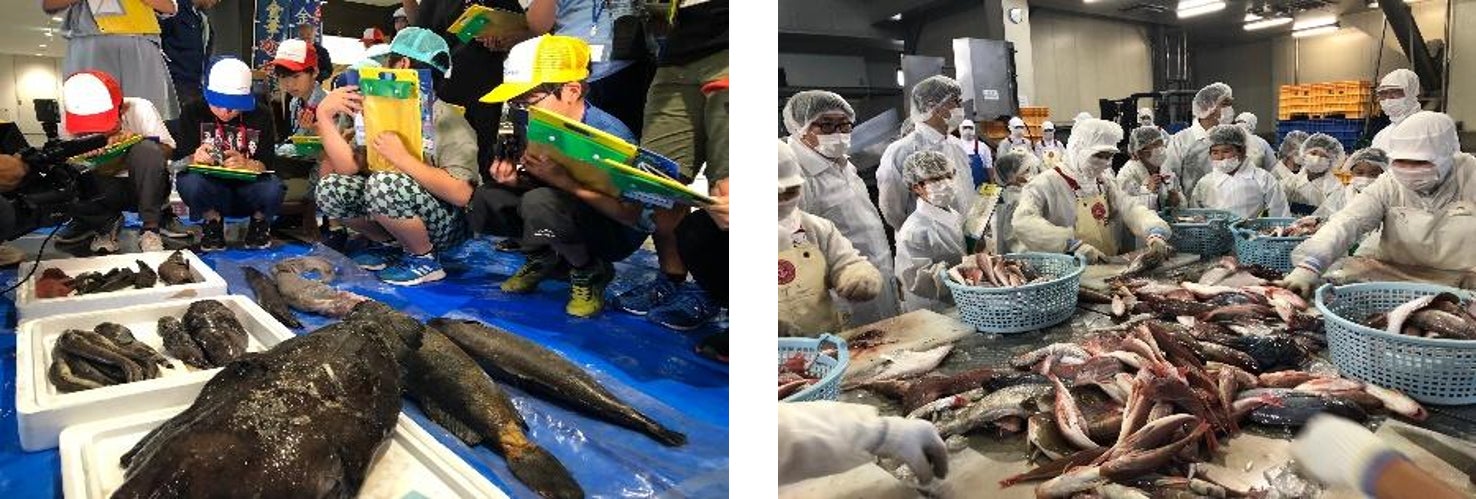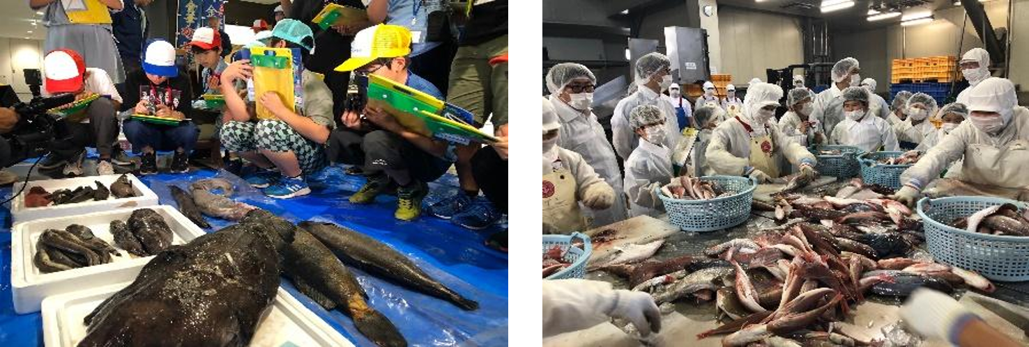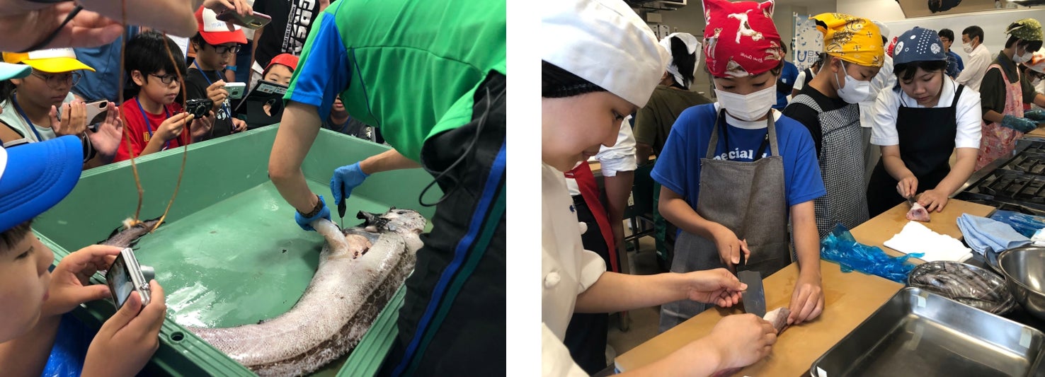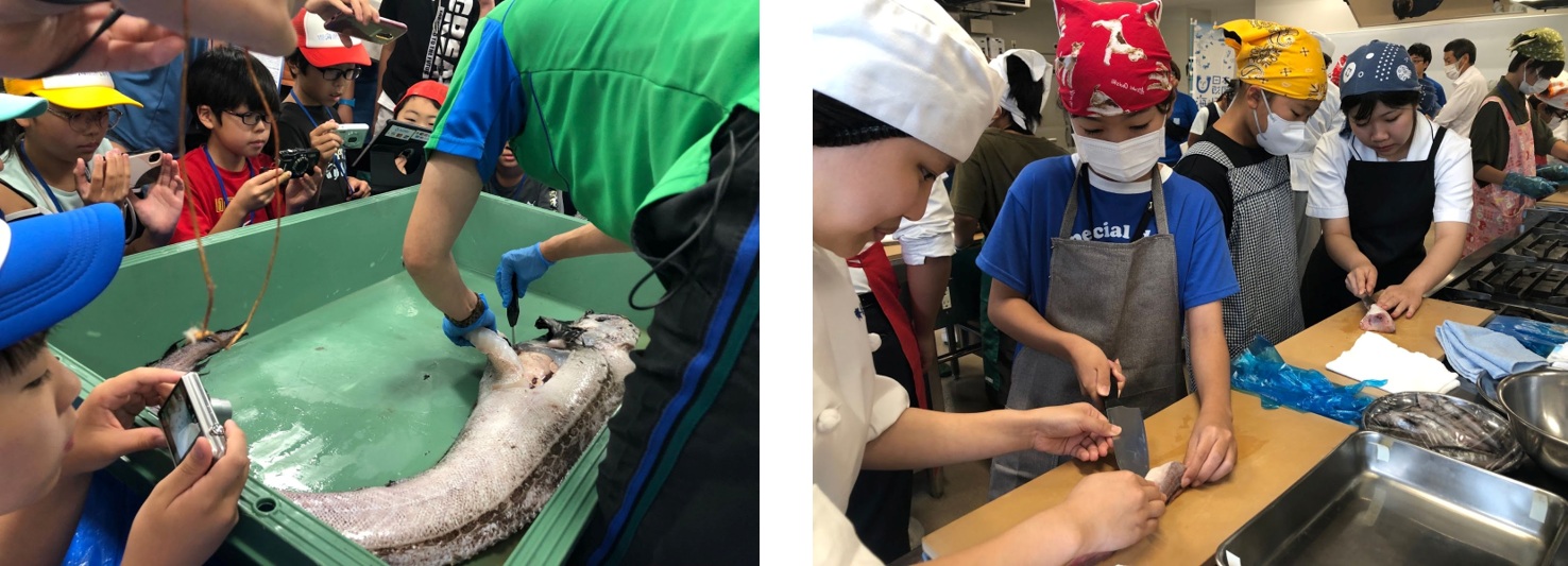 この後、子供たちはバスで明成高校に移動し、明成高校や宮城水産高校の生徒たちと深海魚を調理して、実際に食べてみました。初めて包丁を使う子供もいましたが、高校生たちに教えてもらいながら頑張って深海魚を捌きました。メヒカリの唐揚げなどをおいしそうに、ほおばっていました。