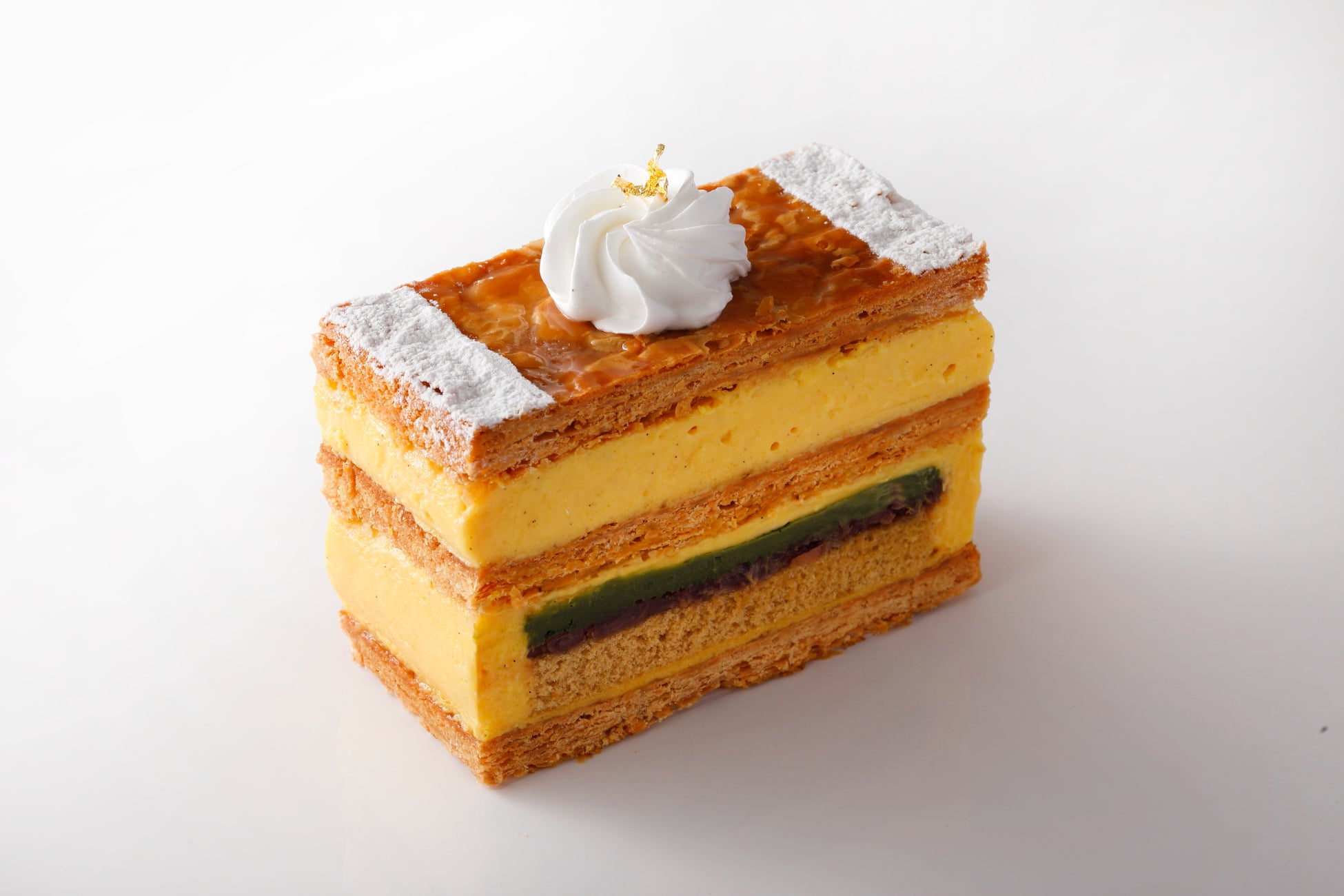 ホテルスイーツで圧倒的人気を誇る、ペストリーブティック〈パティスリーSATSUKI〉。「新江戸ミルフィーユ」はサクッと軽めに焼き上げたパイに、長崎県産太陽卵を使用した黒蜜のスポンジ、八丈島バターを使用した濃厚なカスタードクリームをサンドしました。アクセントにひんぎゃの塩を加え、抹茶のカスタードクリームと黒蜜あんこを入れた和の風味を感じるミルフィーユ。