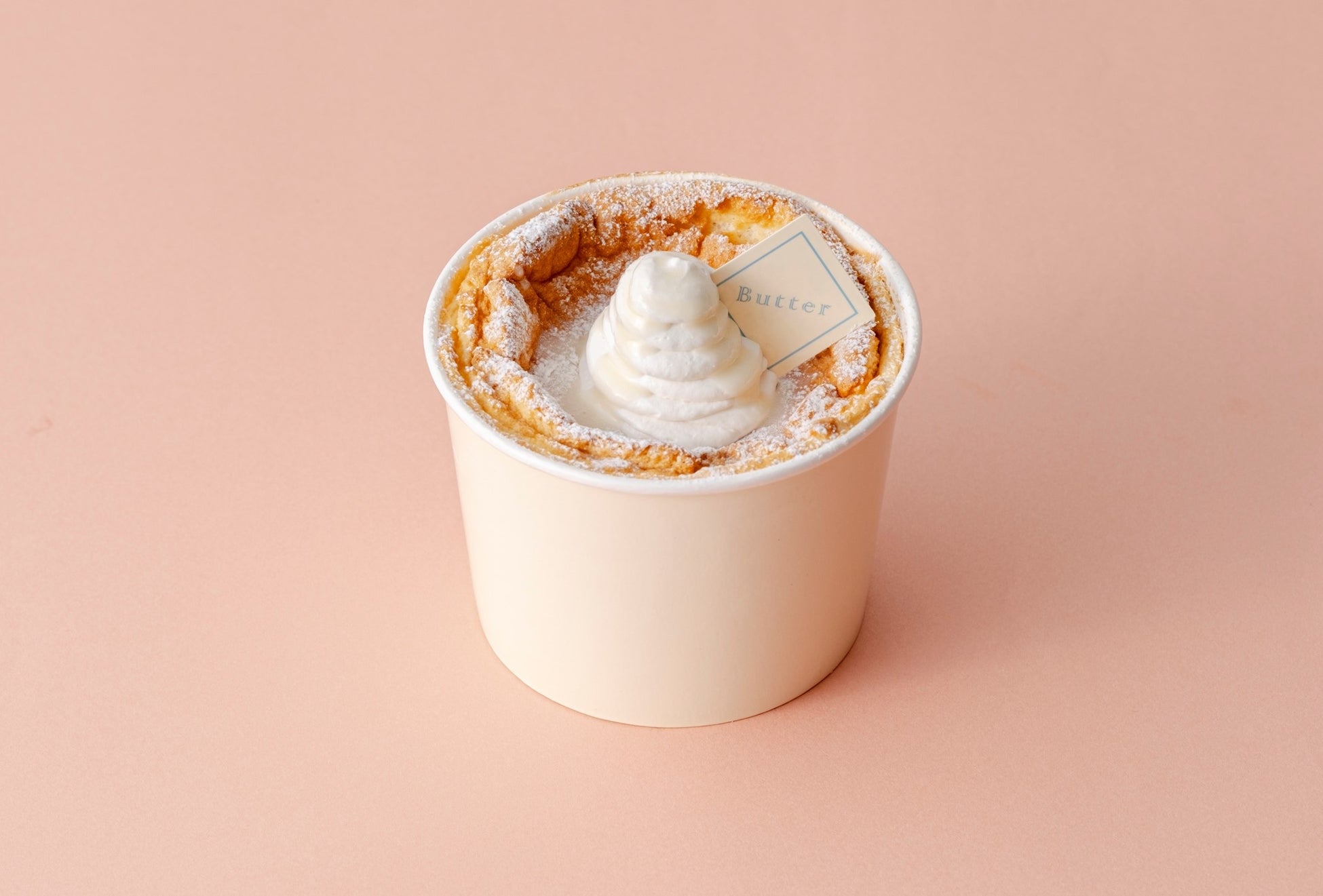 各国の選りすぐりの原材料で作るこだわりのパンケーキスイーツと紅茶のお店〈Butter〉。「生食感スフレ バターメープル」はバター香スフレの美味しさを引き立てるよう、バタークリームにメープルシロップを加えて風味をプラス。生触感のスフレとたっぷりの濃厚バターメープルクリームを堪能いただけます。