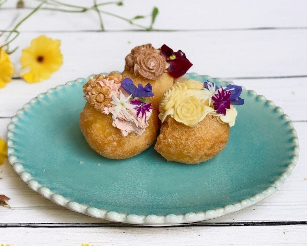 沖縄発のマヌカハニー専門店〈Honey Fusion〉は、沖縄の伝統的なお菓子「サーターアンダギー」をまったく新しいスタイルで提案します。外はカリッと、中はふんわりとした食感が魅力のサーターアンダギーに、香り豊かなハニーバターと彩り鮮やかなエディブルフラワーをトッピング。使用しているバターは、沖縄のマヌカハニー専門店「ハニーフュージョン」が手掛けたオリジナル。ニュージーランド産のグラスフェッドバターに、高品質なマヌカハニーと選りすぐりのフルーツを贅沢に掛け合わせた、風味豊かな特製バターです。バリエーションはプレーン、ストロベリー、カカオの三種類。