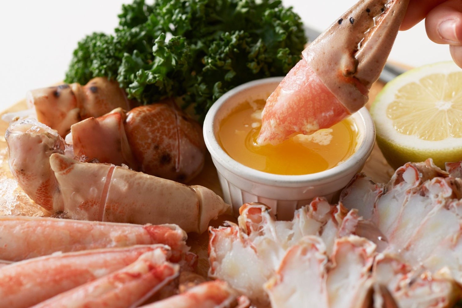 宮城県気仙沼より、漁獲量が極めて少ない為市場にはほとんど出回らない希少な蟹”Deep Sea Red Crab(まるずわいがに)”を提供する〈かに物語〉。「まるずわいがに肩脚肉レモンバターソース添え」は身がぎっしり詰まった蟹の腹部のつけ根、なめらかな食感が楽しめる脚、さらに、貴重な爪や爪下を詰め合わせ、溶かしバターにレモンを絞ったソースを添えました。部位による食感の違いとまるずわいがにのジューシーな美味しさをシンプルにお楽しみください。