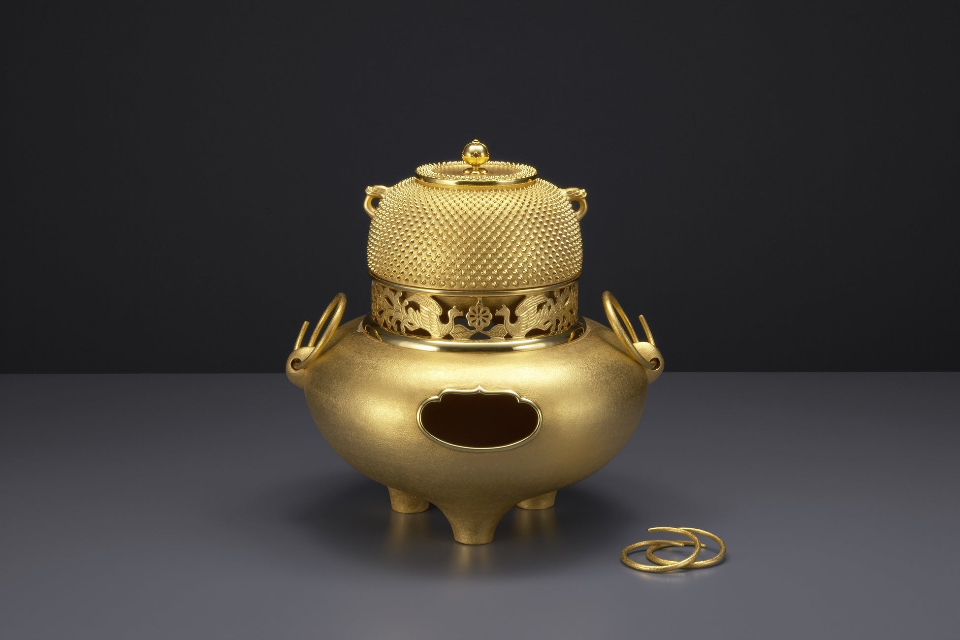 純金製 あられ打茶釜+純金製 岩石打風炉