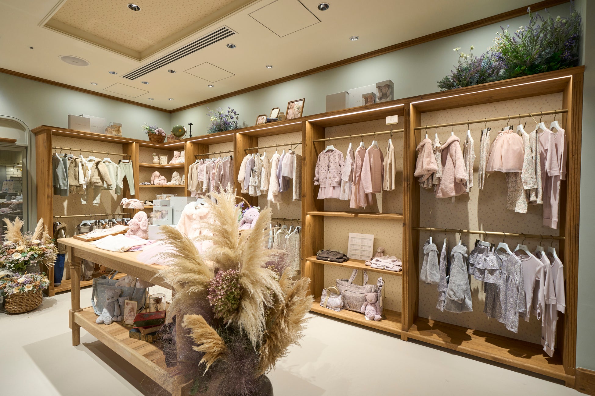 落ち着いた木目調と、壁面や天井に施されたJAMIE KAYオリジナルプリント柄が調和した内装です。上質な雰囲気でありながら、親しみやすくどこか懐かしさも感じられるこだわりの世界観で、ゆっくりとお買い物をお楽しみいただけます。