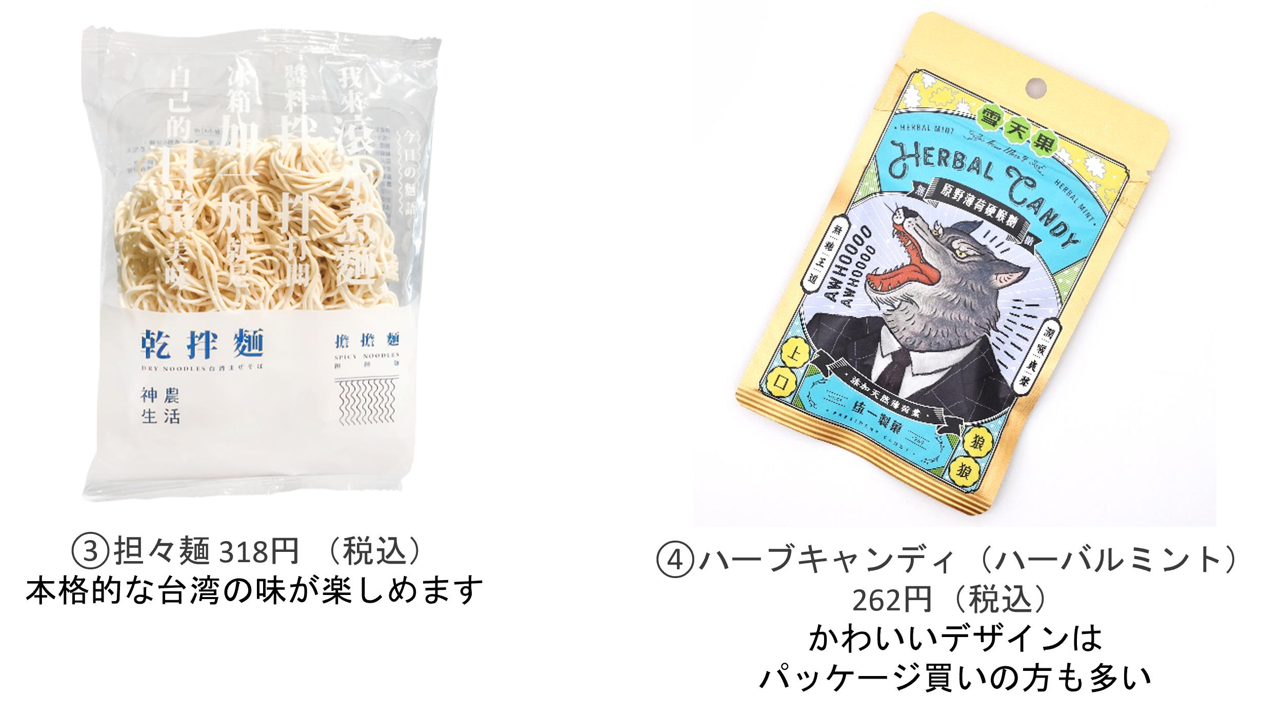 台湾でも日本でも人気の商品で、おいしさはもちろん台湾ならではの独特な色遣いのかわいいパッケージの商品もたくさん揃い、見ているだけでもテンションが上がり楽しんでいただけるストアです。