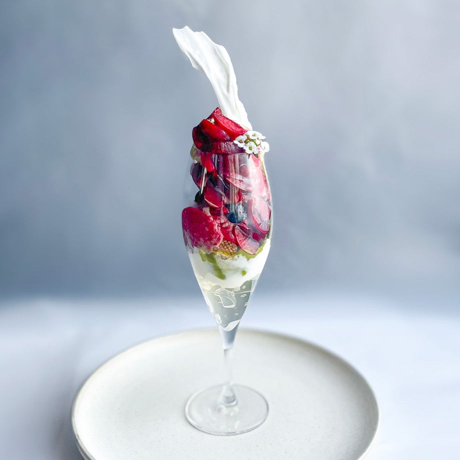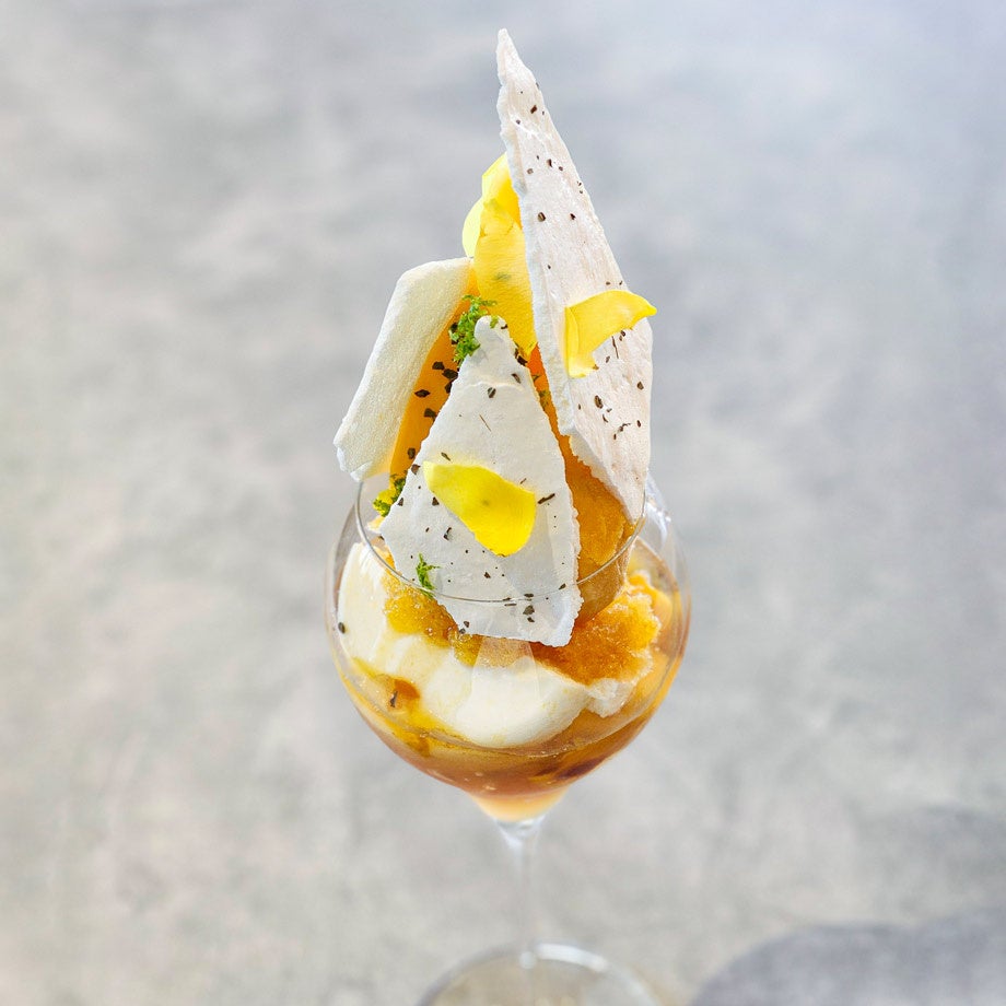 スパイスとハーブ使いが得意なさいたま市内のパティスリー<KazuBake>。濃厚なマンゴーにライムや梅、オリーブと岩塩のサブレ、アロエを合わせ、マンゴーの旨味を引き出しながらミネラル感じるパフェに仕上げました。一番下にはネパール産の紅茶「ミストバレー」のジュレを忍ばせ、さっぱりとした味わいで締めくくります。