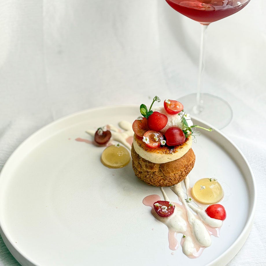 「さくらんぼと枝豆のシブーストシューアイス」はサクサクのシュー生地に枝豆の濃厚なアイスと温かいさくらんぼのフラン、キャラメリゼしたシブーストを添え、さくらんぼをたっぷりあしらいました。