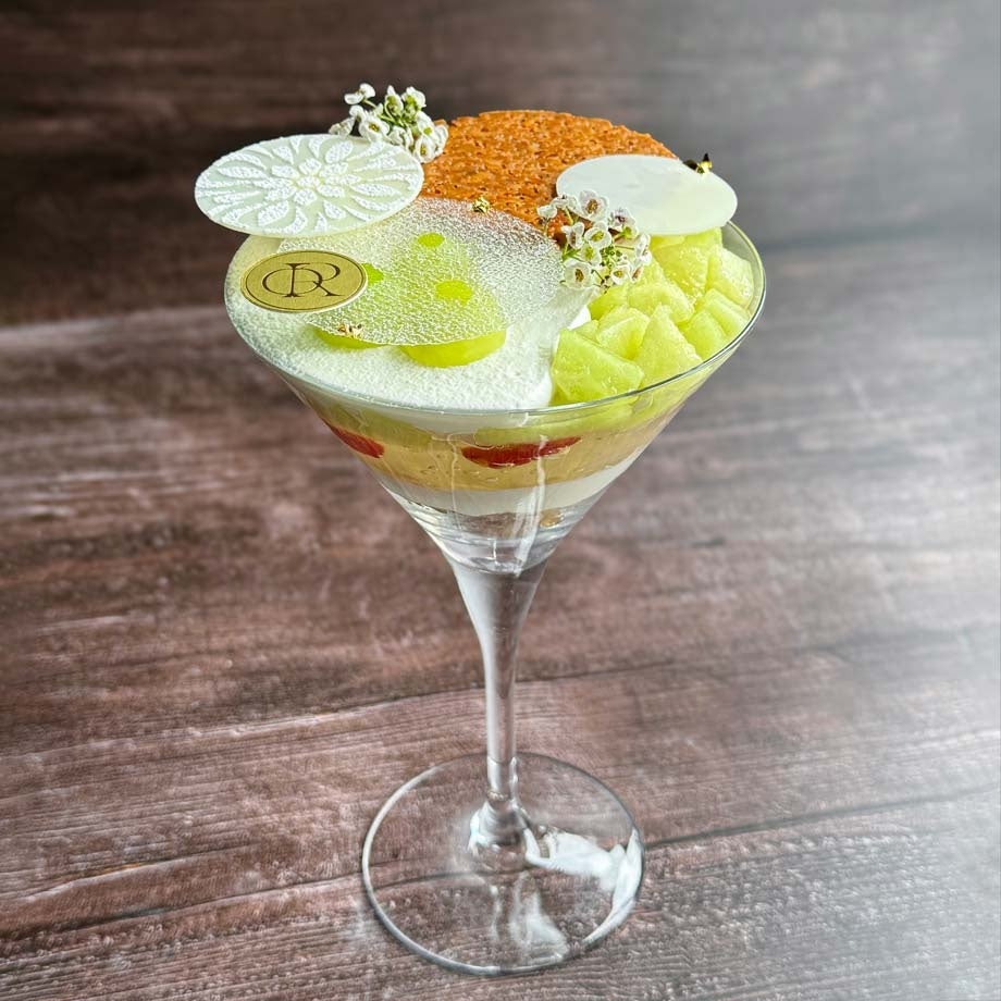 東京<ラ・ヴィ・ドゥース>、フランス、ベルギー各店で腕を磨き、<銀座和光>のグランシェフパティシエも務めた小熊亮平氏が手がけるパティスリー。旬のメロンをたっぷり使ったパフェ。メロンそのものの美味しさを生かしつつ、ココナッツ、白ワイン、フランボワーズ、レモングラスなどを合わせ、いろいろな食感や香りをプラスしました。