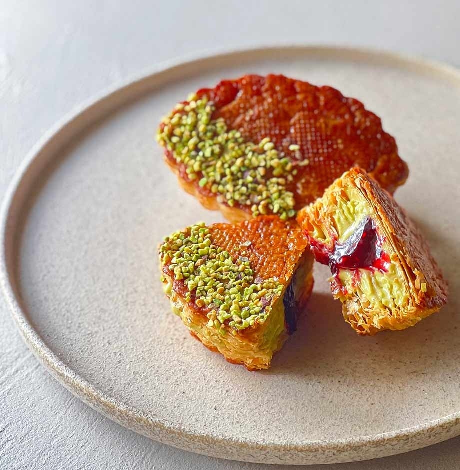 <リフェンリ>の「リーフミルフィーユ ピスタチオベリー」はフランス製発酵バター100%のリッチなパイ生地に、BABBI社のピスタチオで仕上げたピスタチオのクレームパティシエールがたっぷり。苺、フランボワーズ、カシス、グロゼイユ、ブラックベリーの自家製コンフィチュールがアクセント。