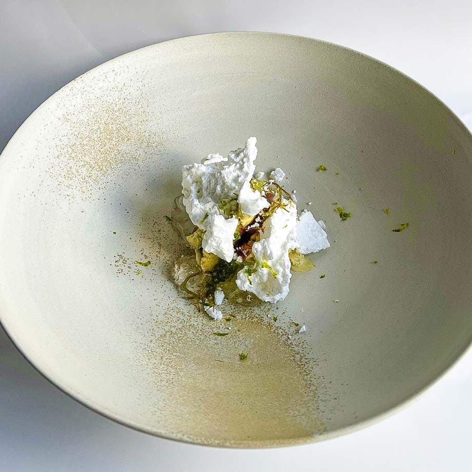 もう一皿は海藻のコンポートや海水のジュレ、コニャックやプルーンと煮詰めた佃煮に泡のメレンゲとコクのある海藻バターのアイスを忍ばせて海をイメージしたデザート。ミニャルディーズ付き。
