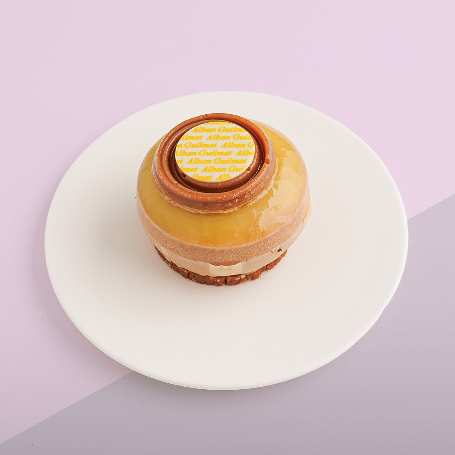 <フォション><ピエール・エルメ・パリ>にも在籍し、2011年に地元にお店をオープンした<アルバン・ギルメ>。フランスの店舗でも人気の「プティガトースィクローン」のプチサイズが登場。ソバ茶のプラリネのタルト生地に、ヘーゼルナッツとミルクチョコレートのクリーム、柑橘のジュレ、渦巻き状に絞ったヘーゼルナッツクリームをのせ、ホワイトチョコレートとソバの実をトッピングしました。