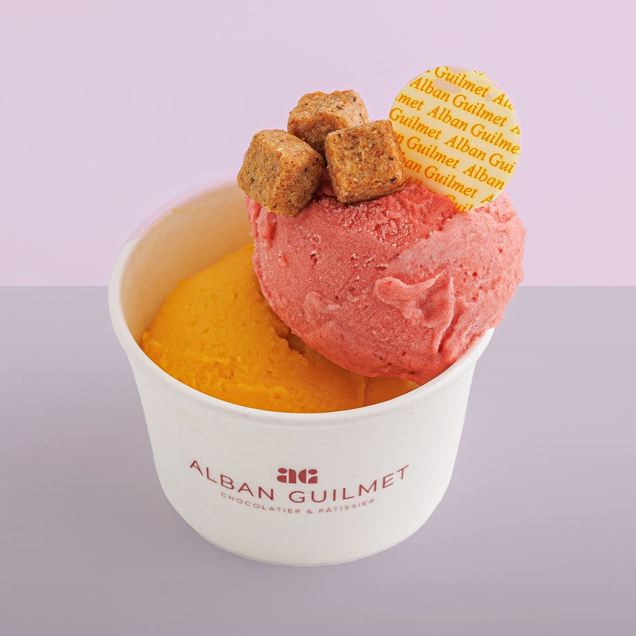 「ソルベ」はブルターニュ産の2つの品種のいちごを使用した上品な甘みが特徴の「ストロベリー」と、甘みの強いマンゴーとさわやかな酸味のパッションフルーツが調和する「マンゴー&パッションフルーツ」の2種類。アルバン・ギルメ氏が来日する3日間限定の販売です。