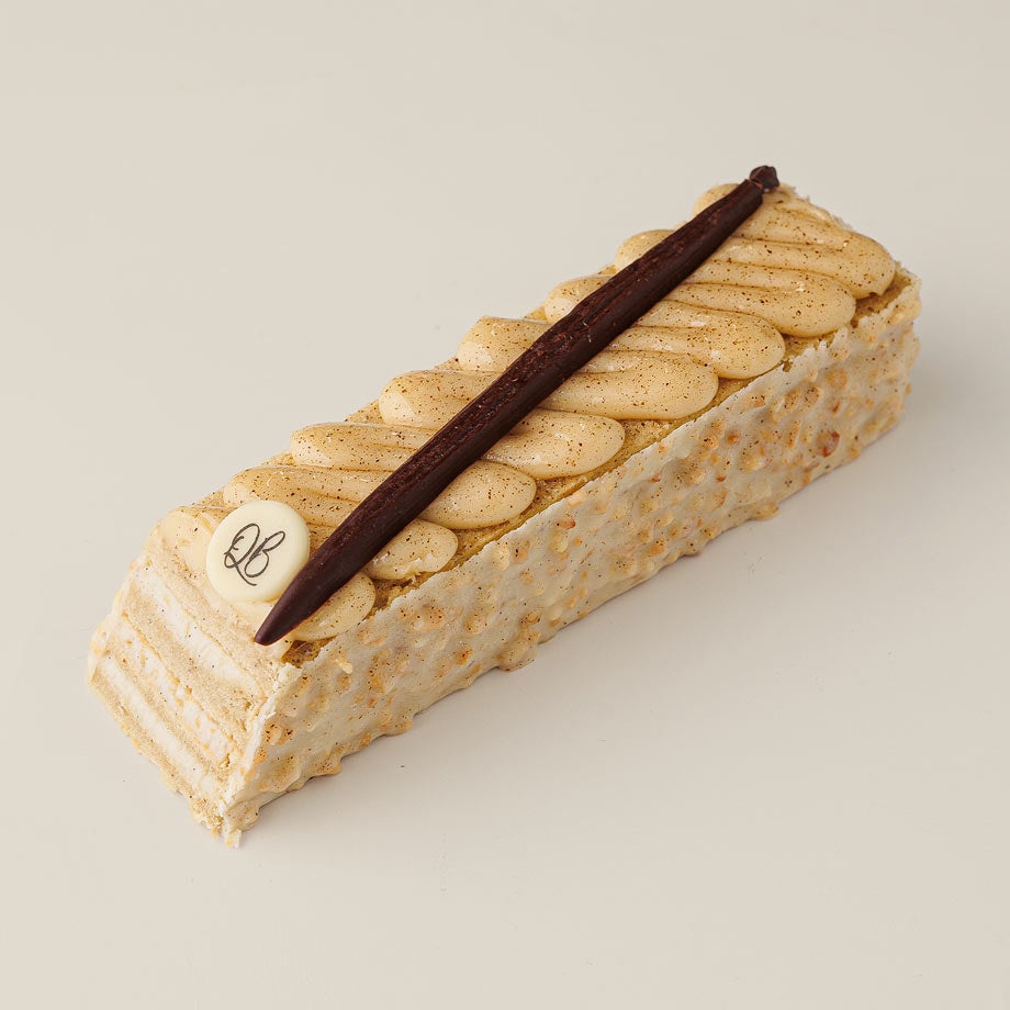 2017年サロン・デュ・ショコラ パリで新人賞、C.C.C.で金賞を受賞しフランスのリールに店舗を持つ<カンタン・バイィ>。バニラが香るしっとりとしたケーク生地に、マダガスカル産バニラビーンズを丁寧に煮出したホワイトチョコレートのガナッシュを贅沢に重ねました。