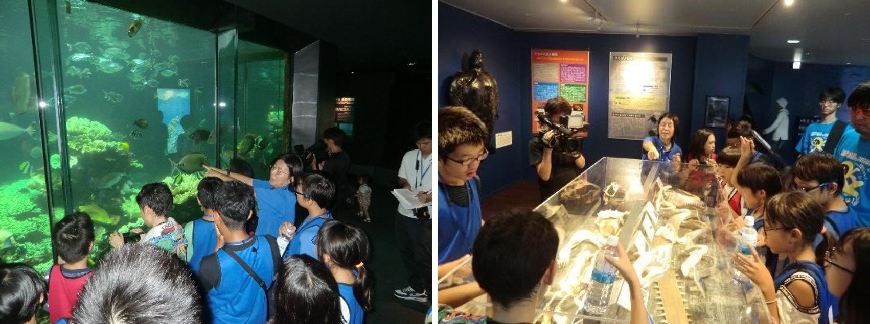 串本の海に住んでいる生き物の展示にこだわった串本海中公園で森美枝館長から串本の海の特徴やそこに住む生き物について教えていただきました。黒潮の影響を受けている串本の海は、抜群の透明度と冬でも15℃を下回ることがない温かい水温を誇り、そこでは、色とりどりの熱帯魚や世界の北限と言われる本州最大のテーブルサンゴの群落など美しい海中景観が1年中楽しめます。そんな串本の海を再現した水族館や水深6mの自然の海の中を観察できる海中展望塔を見学し、子ども達は食い入るように生き物を観察していました。中でも、水族館でのサンゴの飼育年数日本一を誇る「ウミバラ」の大きさにはとても驚いていました。