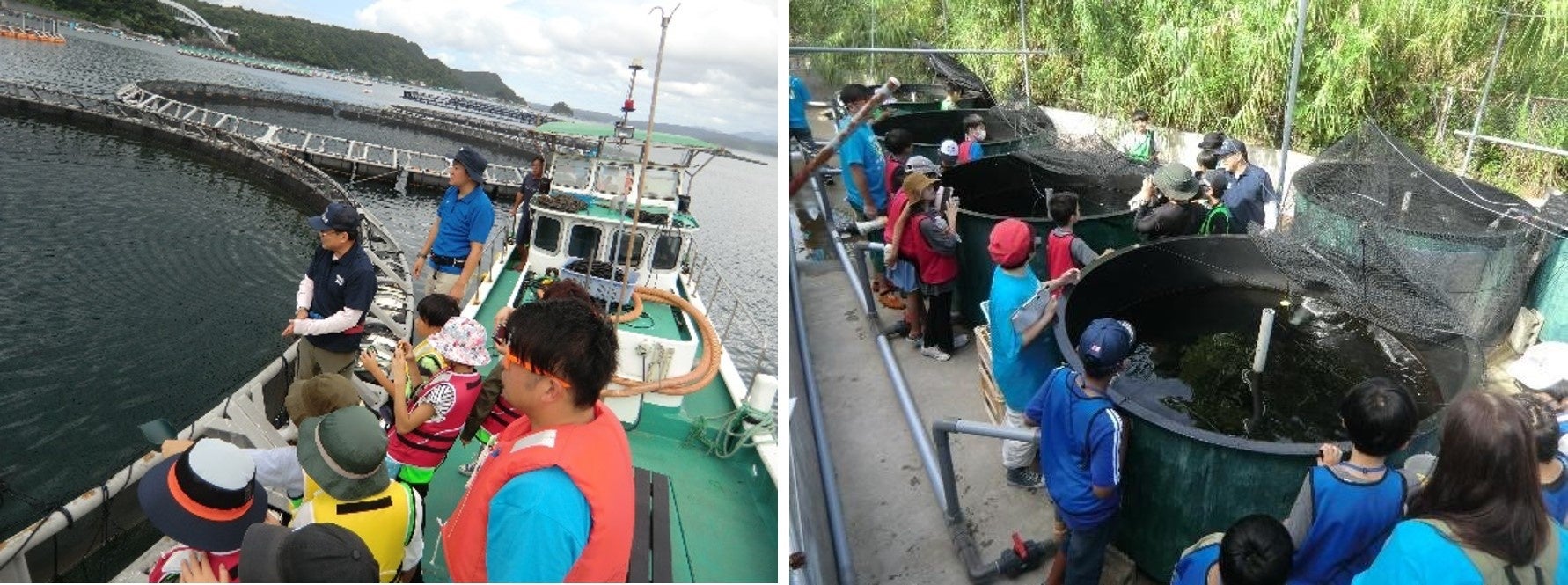 その後、実際に養殖生け簀を見学し、餌やりを体験しました。子ども達からは「クロマグロを完全養殖するにあたって、苦労したことは?」、「クロマグロが成長するのに大切なことは?」などの質問が出て、養殖の仕事について興味を持って学ぶ姿勢が見られました。升間所長のお話や養殖生け簀見学、また水産研究所が現在取り組んでいることの一つ「アイゴの廃棄野菜を餌にした養殖」の意義などのお話を通して、「なぜ、海を汚してはいけないのか?」、「なぜ、養殖が研究されているのか?」を知り、子ども達一人ひとりに何ができるのかを考えるきっかけになりました。