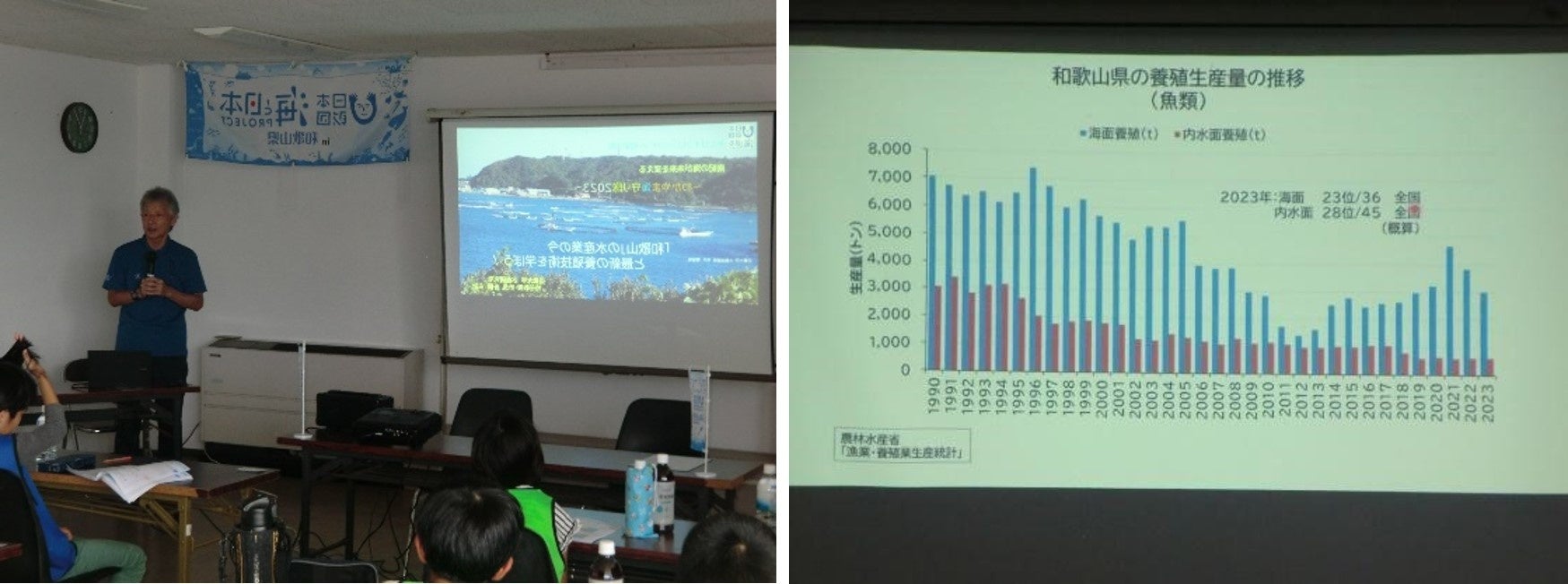 続いて、近畿大学水産研究所の升間主計所長から、和歌山県の水産業の現状や持続的な水産資源を確保するための1つの方法である養殖業の大切さを教えていただきました。升間所長は、水産資源は環境バランスの良い海で適切な漁獲量を守っていれば再生産が可能な資源だが、近年は水温や海流の変化など環境の悪化により魚の数が減り漁獲量が消費量を下回っており、その不足した分を補うために増殖技術や最先端な養殖技術を研究し、天然の水産資源に依存しない完全養殖に力を入れていると話します。中でもクロマグロの完全養殖は難しく、マグロは稲光でパニックを起こしてしまったり、台風の影響で海の中が濁ってしまうと、生け簀の網に体をぶつけてしまったりして死んでしまうことがあるそうです。