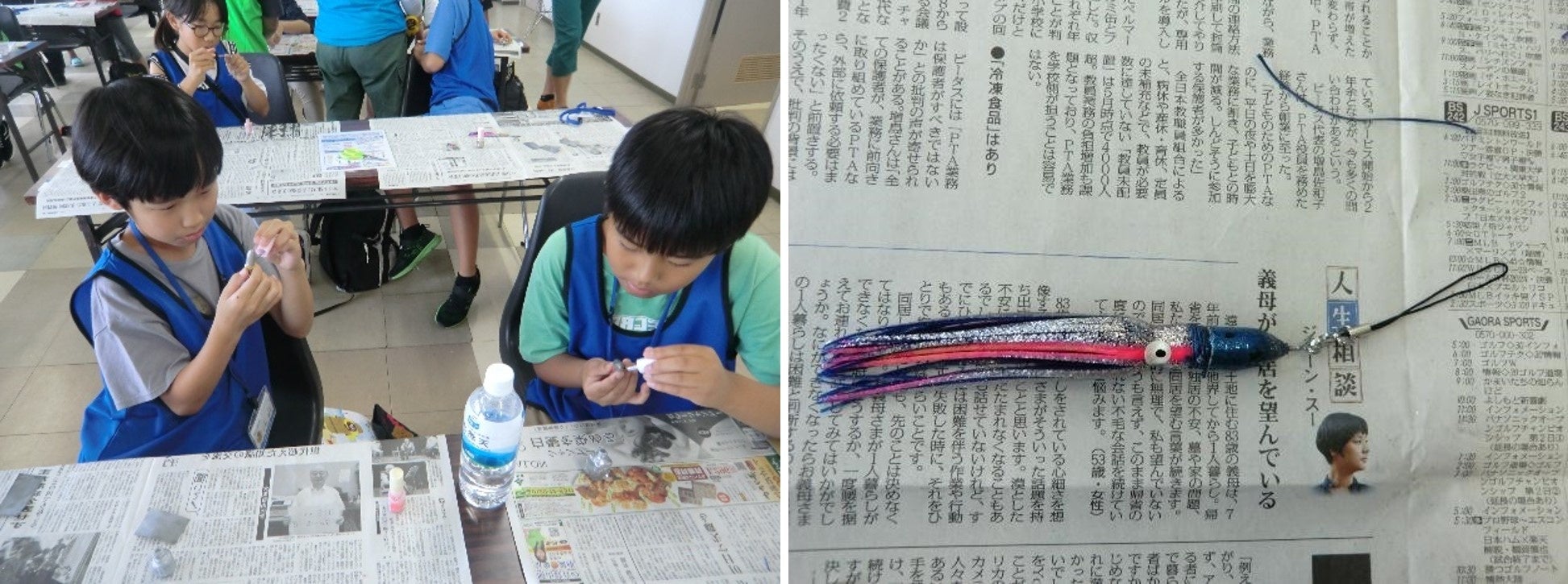 和歌山県串本地方には1500~2000もの多種多様の魚が住んでおり、沿岸地域は日本初の海中公園になっています。その地で行われている「ケンケン漁」の漁具作り体験を南紀串本観光協会の宇井晋介事務局長の指導のもと、ケンケン漁の歴史や現状の漁獲高が減少し漁業者が減少している現状を学習したうえで体験しました。ケンケン漁は「土佐の一本釣り」の漁師が1本の竿で次々と釣り上げる豪快な漁法とは違い、小型漁船を走らせながら長い竿の先についた擬餌針で1本づつ釣り上げる漁法で魚に傷がつきにくいのが特徴です。狙う魚にマグロ・ブリ・カジキなどがあり、種類によって漁具(ルアー)があることを学習し、今回は、串本がカツオの町でもあることからカツオ用の漁具作りを体験しました。子ども達は、各自オリジナルな漁具を作りストラップにしていきます。胴体を作る作業に悪戦苦闘しながらも完成した時の笑顔が印象的でした。
