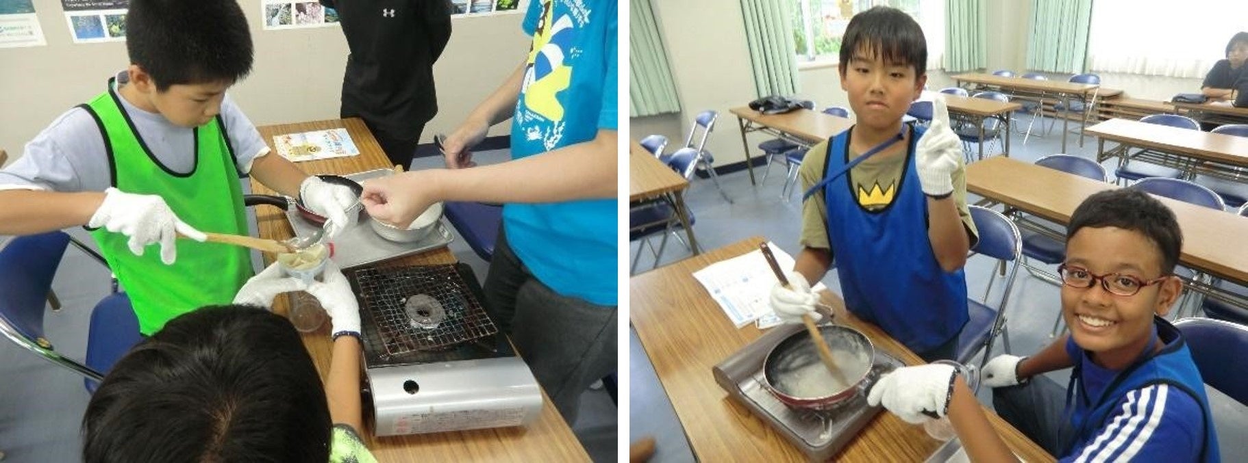 宿泊先でもある潮岬青少年の家で後藤歩指導員より串本の海水から塩づくりの指導を受けて体験しました。2人1組の班に分かれて、海水(500cc)をろ過して、小さな海藻・マイクロプラスチックといったごみ等を取り除く→煮詰める→再度ろ過→フライパンで更に煮詰める→塩とにがりに分ける→乾かすといった工程で塩(約12g)に仕上げていきます。子ども達のほとんどが塩づくりは初めての体験で、目を輝かせながら取り組んでいる姿が印象的でした。出来上がった塩の味見をして、「辛い」、「まろやか」など各々の感想を述べていました。中には他の班が作った塩と自分たちが作った塩の味を比べ、「こっちの塩は味が尖っている」といった大人顔負けの食レポをする子どももいました。