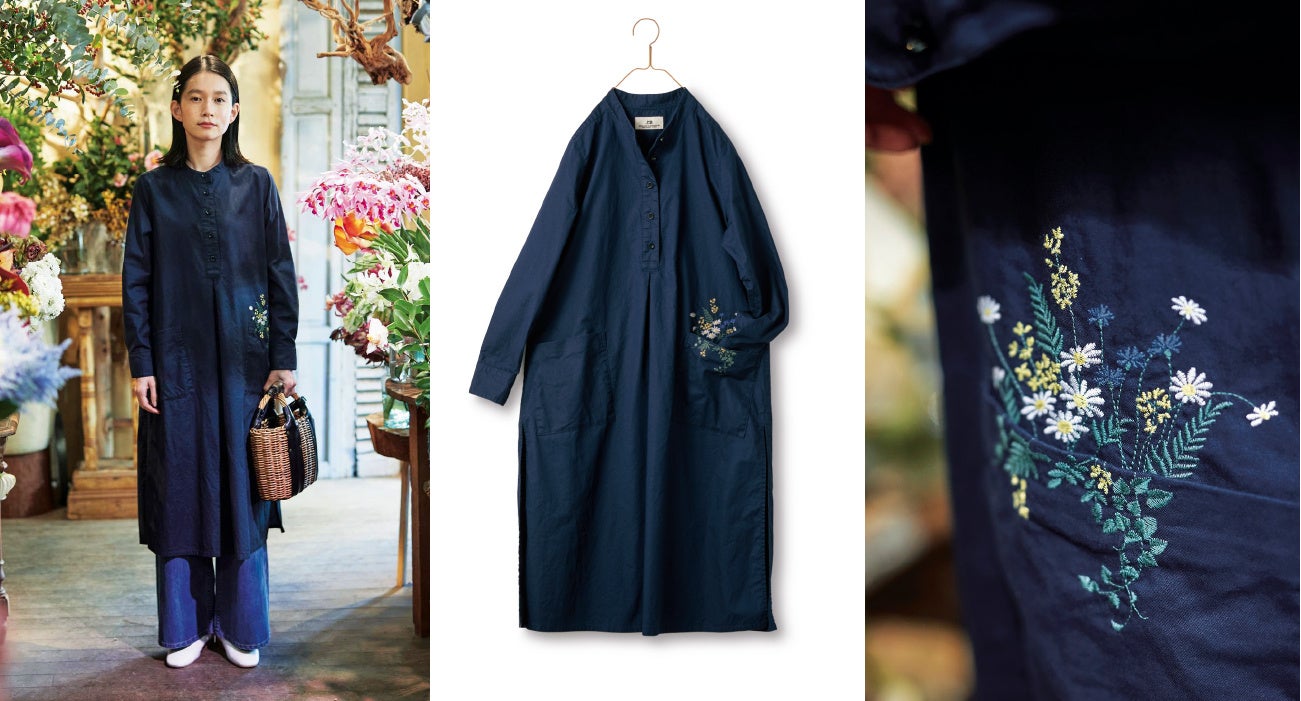 綿100%の生地を使ったスタンドカラーのワンピースです。ポケットに、詰め込んだ野花の花束があふれ出しているような刺しゅうがあしらわれています。畦道を散歩しながら、わきに咲いている草花を摘んで花束を持ち帰った気分になれる一着です。