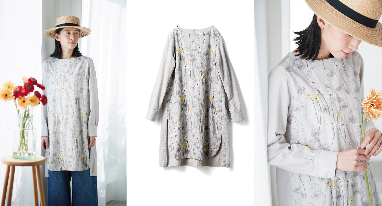 ガーベラをモチーフにしたロング丈のチュニックです。プリントではなく、刺しゅうをほどこしガーベラを立体的に仕上げており、華やげな印象を与えます。グレーベースの生地にグレーの糸でステッチ刺しゅうは、品よく落ち着いた雰囲気です。