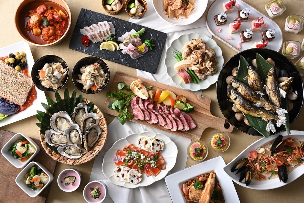 牛肉の鉄板焼き/ 鮎の塩焼き / 鯛・帆立・ムール貝のサクラエビ薫るマリニエール風 / スパイス香るソイフルボールと野菜の煮込み / 牡蠣と空豆のコンフィ キャトルエピスの香り / 牡蠣フライ / 牡蠣飯 / 桜香る牡蠣の洋風茶碗蒸し / 殻付牡蠣 / サラダバー / デザート各種 など