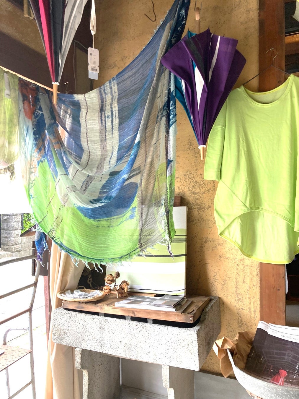 さらに独自の技法でより軽くてやさしい風合いの生地が生まれ、色柄も「イッテンモノ」にこだわったショールやウェアが人気です。