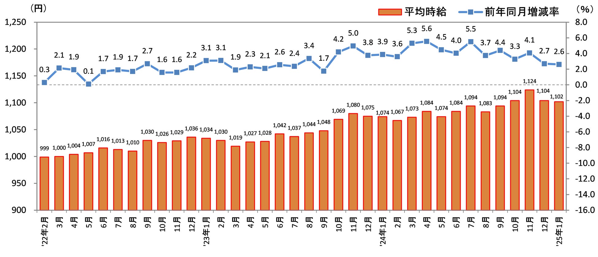 北海道の1月度平均時給は前年同月より28円増加の1,102円