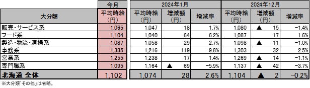 北海道の平均時給は1,102円(前年同月1,074円、前月1,104円)