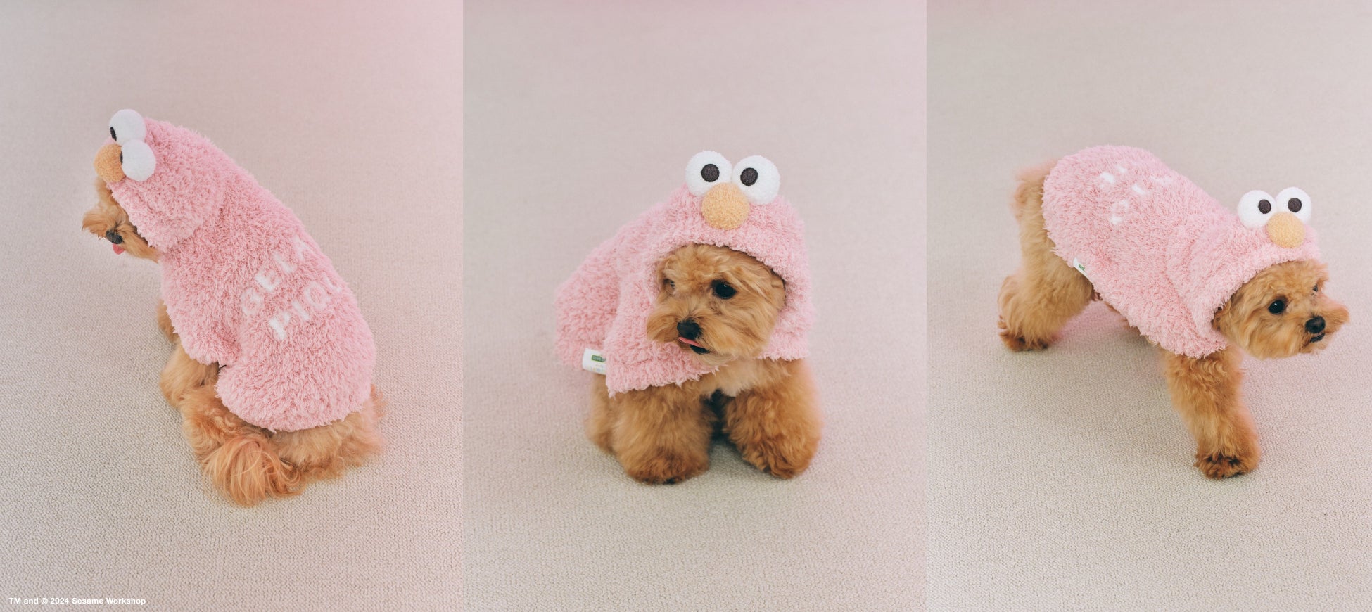 ふんわり、もこもこの’ジェラート’素材をベースに、フードにエルモとクッキーモンスターをデザインした犬猫用ケープ。お腹周りはベルト付きなので、歩いてもずれにくいのがポイント。