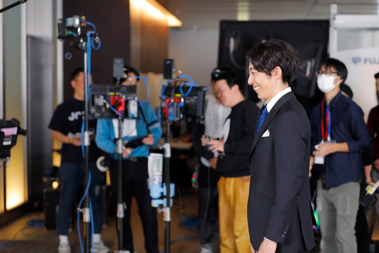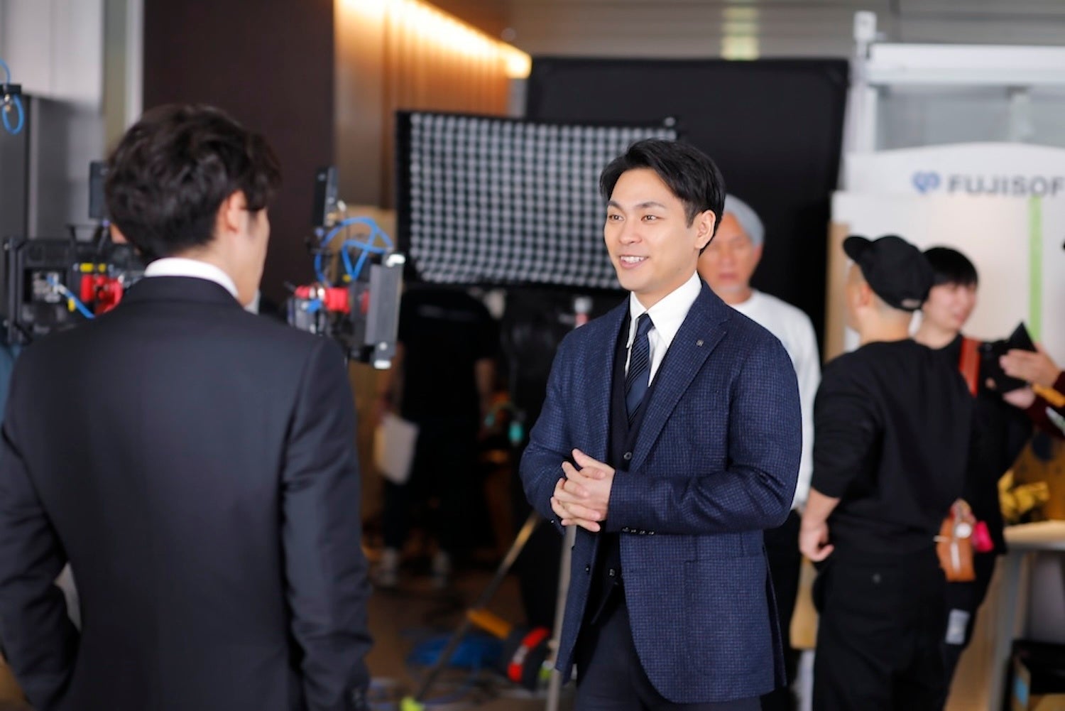 今回の撮影は都内の複合ビルで行われました。おなじみのビシッとしたスーツ姿で、およそ半年ぶりの再会を喜ぶ高橋さんと柳楽さん。笑顔で挨拶を交わすとすぐに撮影が始まりました。せりふは「リクルートエージェント」のみというシンプルな役柄だからこそ、エレベーターのシーンでは扉の動きに合わせ絶妙なタイミングで体を寄せ合うなどアドリブを交えた演技を披露してくれました。「転職を迷っている方に対して寄り添うのは難しいこと。さりげなく上品な距離感が良いですよね」と言う高橋さん。また柳楽さんも「シリーズ開始からずっとフリースタイルでやらせてもらえるのはありがたいです」と話すように、テイクごとに「こう撮ってみてはどうか」といったチャレンジを交え、優しい表情とキレキレな動きで絶妙なコンビネーションを披露。カットの合間に談笑しながら「毎回撮影が楽しいんですよ」と、終始エネルギッシュな空気感の中で撮影が行われました。