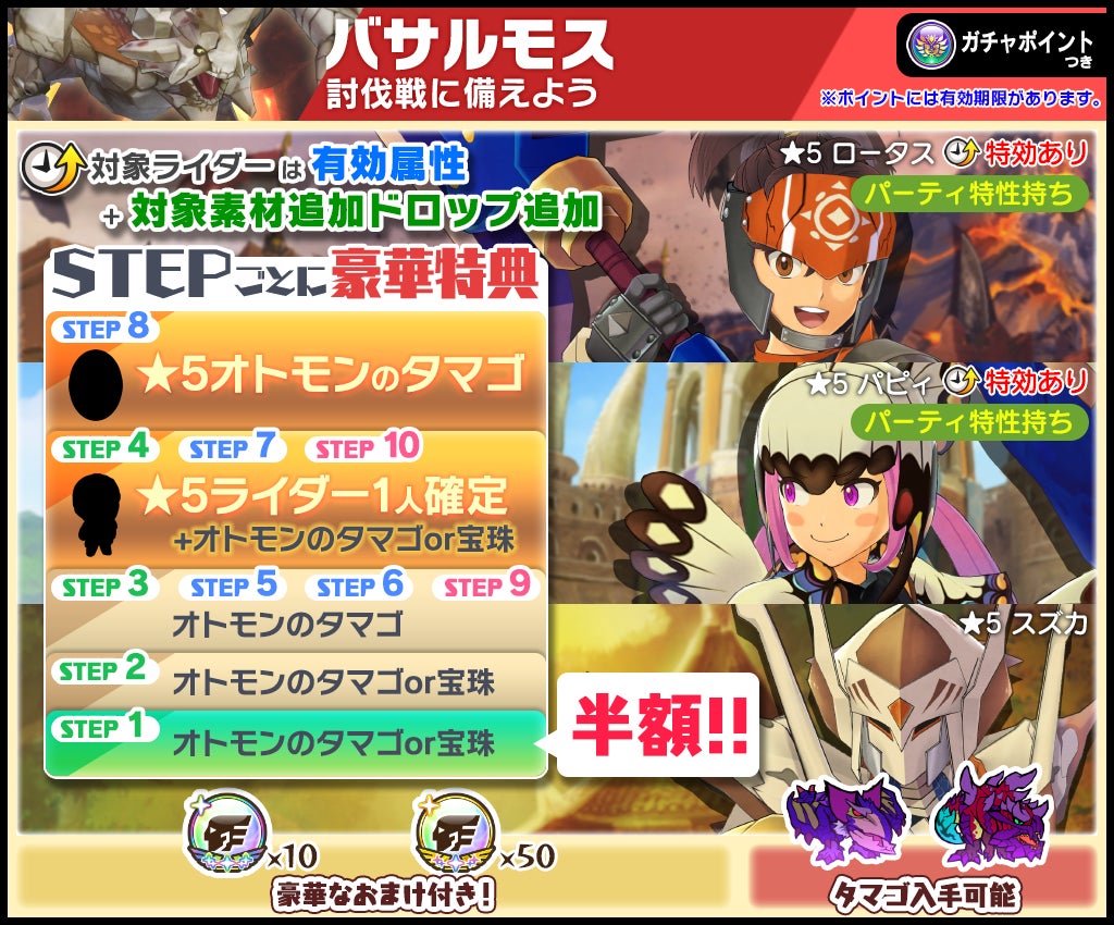 また、討伐戦モンスター「バサルモス」の攻略に有効なライダー「ロータス」「パピィ」「スズカ」が登場する「竜騎祭ガチャ」を配信します。