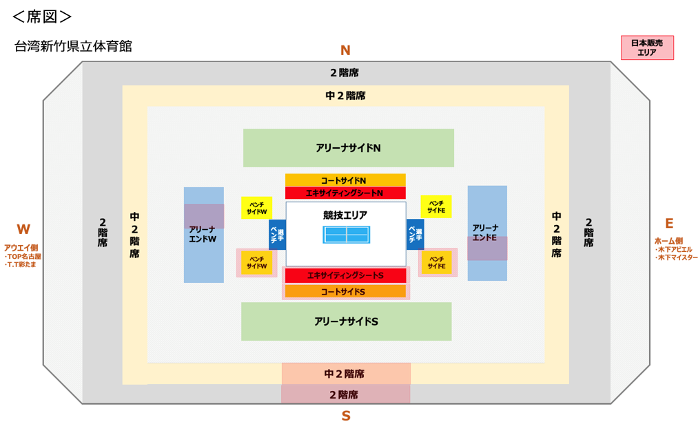 ※3 アリーナエンド席のチームサイドは 「エンドE」(木下アビエル神奈川、木下マイスター東京) 「エンドW」(トップおとめピンポンズ名古屋、T.T彩たま)となります。