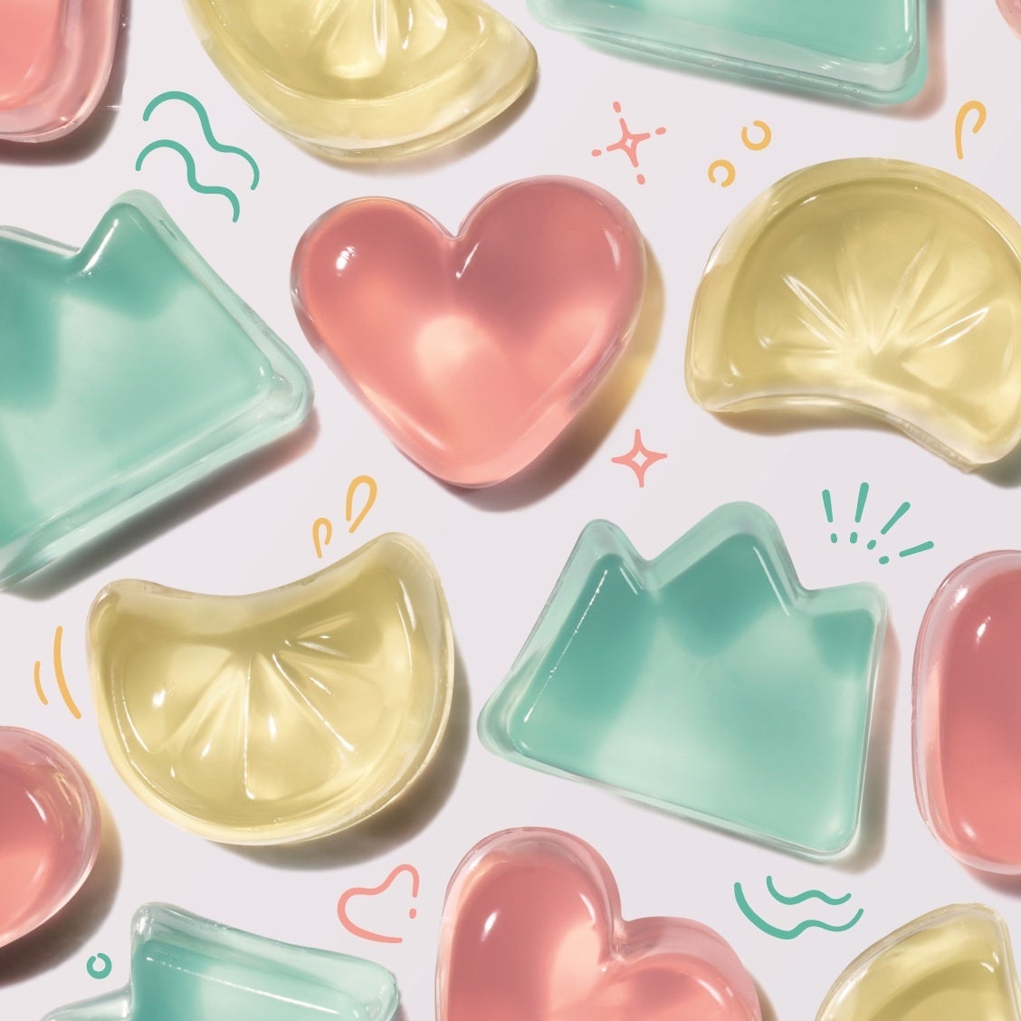 ラインナップは、成分や気分で選べる3タイプ。「ぴかぴか」には「ビタC※2」を配合し、もぎたてのみずみずしい輝きを放つ果物をイメージした形に。「そよそよ」には「CICA※3」を配合し、そよそよと風になびく、健やかな植物をイメージした形に。「ぷりぷり」には「ペプチドGL※4」を配合し、心躍るような躍動感を表現したハートをイメージした形に設計しました。