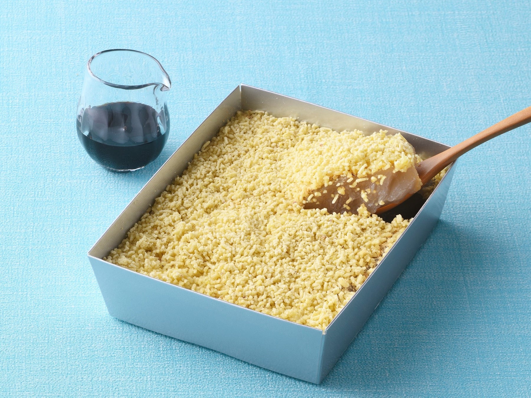 ほんのり塩を合わせた信州伊那栗の栗餡をそぼろ状にし、ぷるんとなめらかなわらび餅にたっぷりとまぶしました。お好みで黒みつをかけて味わえます。