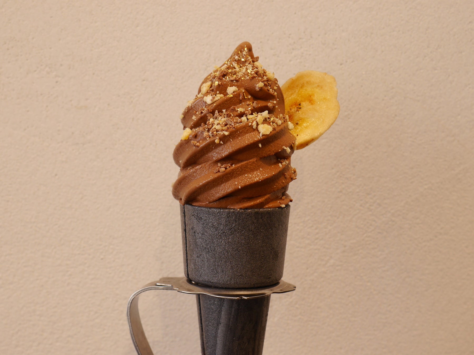 チョコレートのソフトクリームの上には、砕いたバナナチップス、チョコフレーク、能登の粗塩をトッピングし、仕上げにバナナチップスを一枚添えました。金沢らしい和菓子も洋菓子も楽しめる、新感覚のチョコソフトクリームです。【実演】