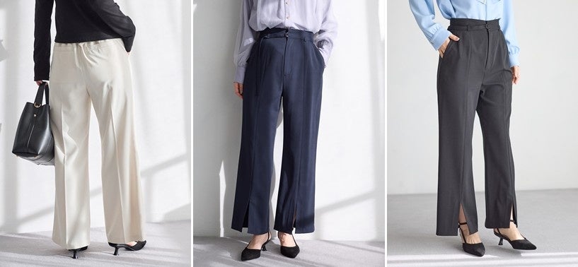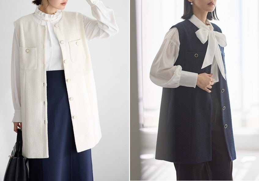 「硬すぎないツイードジレのセットアップ」、「1枚でトレンドも華やかさも演出するブラウス」、「美脚効果と着回し抜群なスリットフレアーパンツ」など、着回し抜群なアイテムをラインアップ。