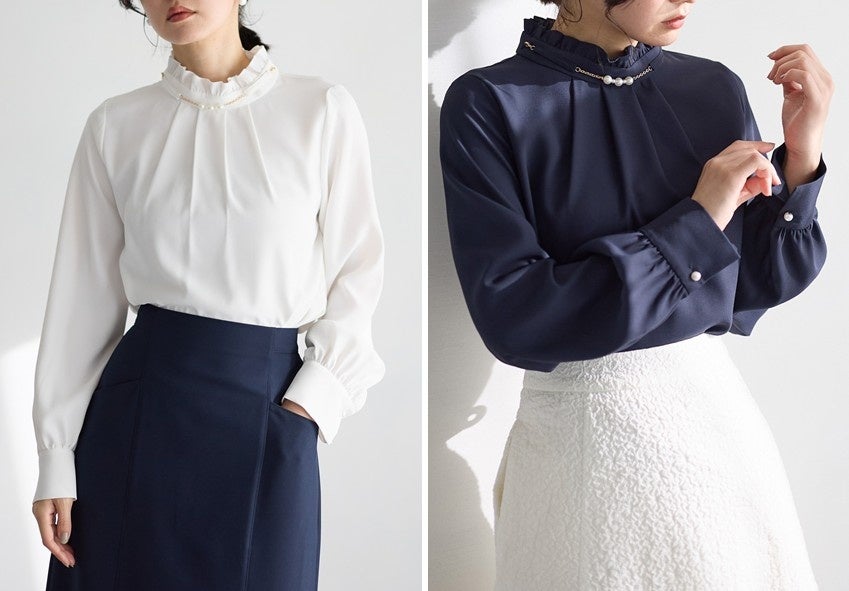 オフィスからフォーマルまで幅広く活躍する、フリルスタンドカラーブラウス。