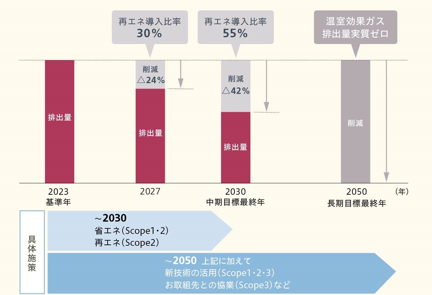 具体的には、Scope1および2の排出量を2023年度比で42%削減します。また、Scope3の削減に向けても、SBTの水準に則って目標を策定いたします。