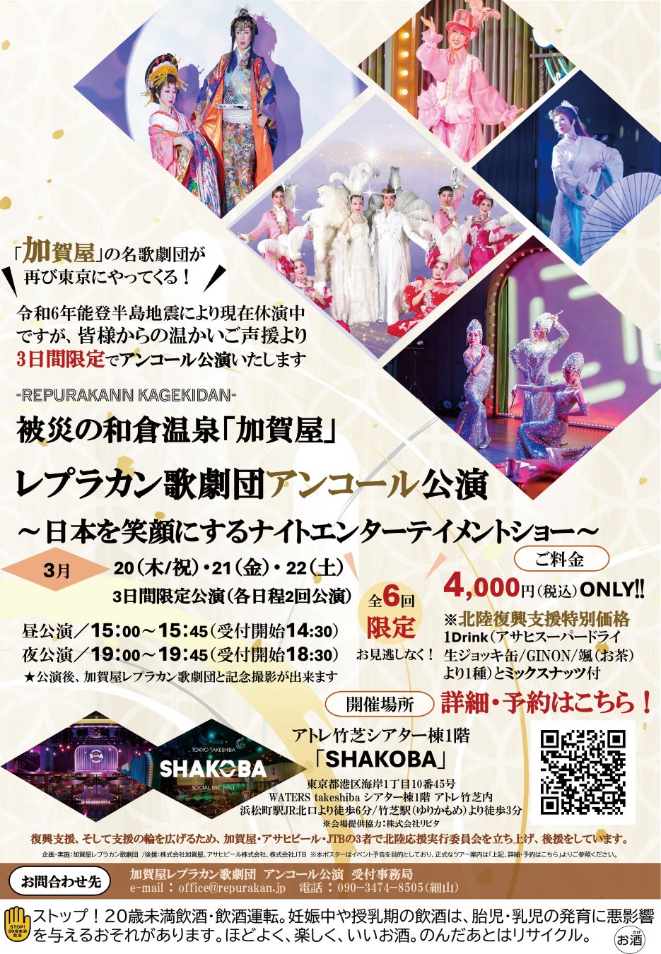 『加賀屋』レプラカン歌劇団アンコール公演が2025年3月20日 (木・祝) 〜 2025年3月22日 (土)にSHAKOBA(シャコウバ)(東京都 港区 海岸1丁目10番45号 WATERS takeshiba シアター棟1階 アトレ竹芝内)にて開催されます。