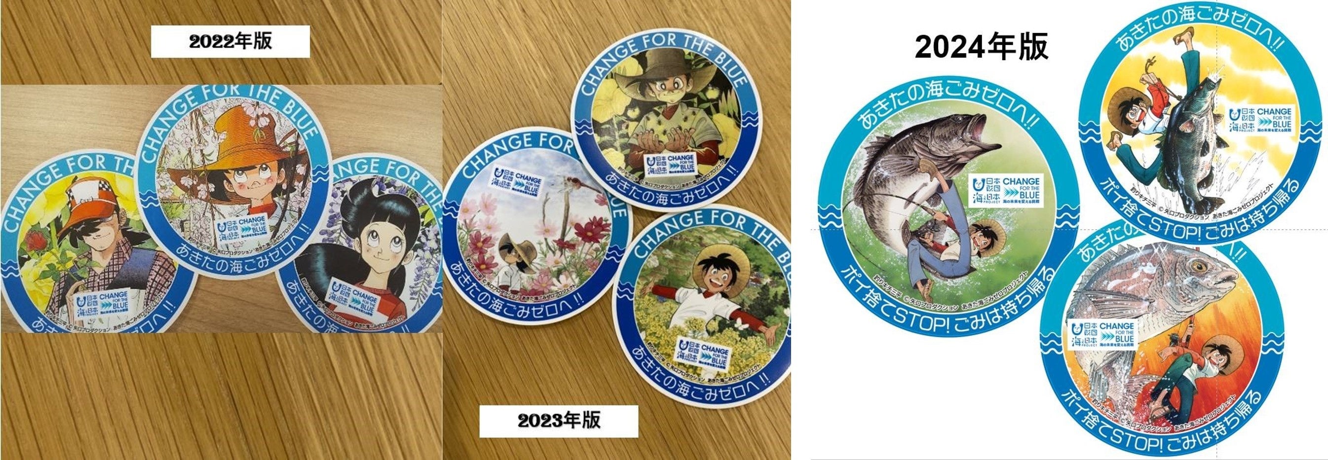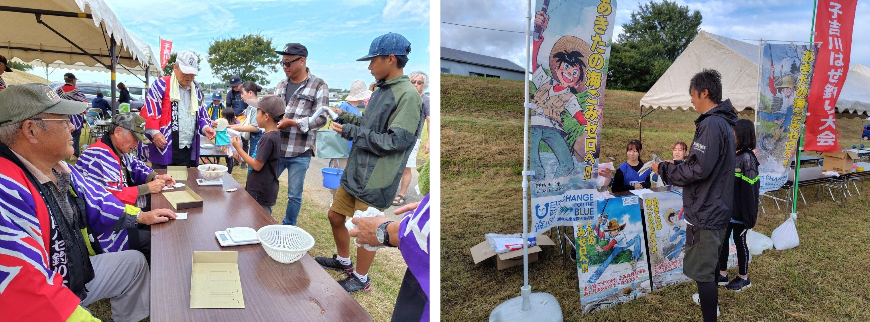 71回目の開催となる歴史ある子吉川はぜ釣り大会は、清流子吉川を舞台に、市民が釣りを通して日頃の腕前を競い合う秋田を代表する釣り大会です。漁業の伝統や食文化、子吉川の美化、愛護などを伝承しながら楽しく一日を過ごすことを目的として始まり、例年、腕自慢の釣り人から家族連れまでおよそ100人以上が参加します。子吉川が日本海に流れ込む河口では、はぜ釣りとはいえ、鯉やシーバスなどの大物を釣り上げる人もいて大いに賑わいます。この多様な生態系を大切にするべく「あきた海ごみゼロプロジェクト実行委員会」は、川や海に接する機会の多い「釣り人」へ海洋ごみや釣り場のごみ問題の啓発活動を行ったほか、CHANGE FOR THE BLUEごみ袋を配り、周辺のごみを拾った方に「釣りキチ三平オリジナルステッカー」を配りました。また、「釣りキチ三平ごみ拾い隊」を結成し、釣り人たちと一緒にごみ拾い活動も実施しました。釣り場のごみ削減に対しての意識向上を図ります。
