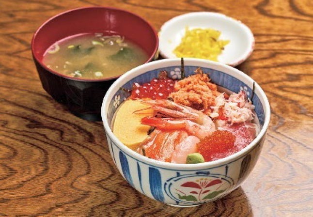 観光客にも地元民にも愛される、コスパ抜群な有名食堂。市場の店ならではの鮮度抜群なネタを使用しており、まさかの550円で海鮮丼が味わえ、特に脂乗り抜群のマグロは絶品。8種の海鮮ネタを使用した「五目丼」を含む名物の「550円丼」(全6種)は、+110円でご飯大盛も可能。市場のにぎわいを感じる広い店内には小上がりもあるので、ゆっくり食事を楽しんで。 五目丼(味噌汁、漬物付き) 550円